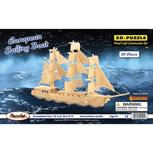 European Sailing Boat - Illuminated 3D Wooden Puzzle. The European Sailing Boat 3D wooden puzzle is a challenging and creative toy made of high grade 3mm natural wood and comes in a shrink-wrapped package with instructions and sandpaper included. This fine European Sailing Boat is part of our boats coll... - European Sailing Boat - Illuminated 3D Wooden Puzzle.