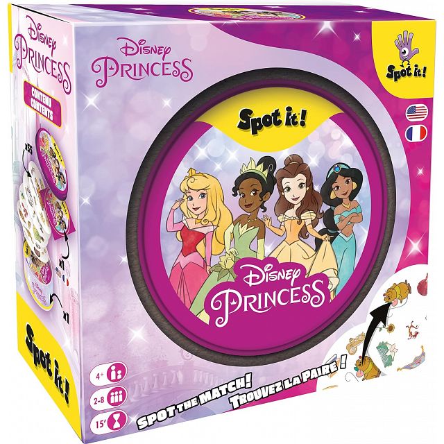 Spot It! Disney Princess. This version of Spot it! combines your favourite Disney Princesses, with one of the most emblematic family games. Players try to spot the single matching symbol between 2 cards in a playful battle of speedy observation, featuring some of the most ico... - Spot It! Disney Princess. | | $24.99 More Information